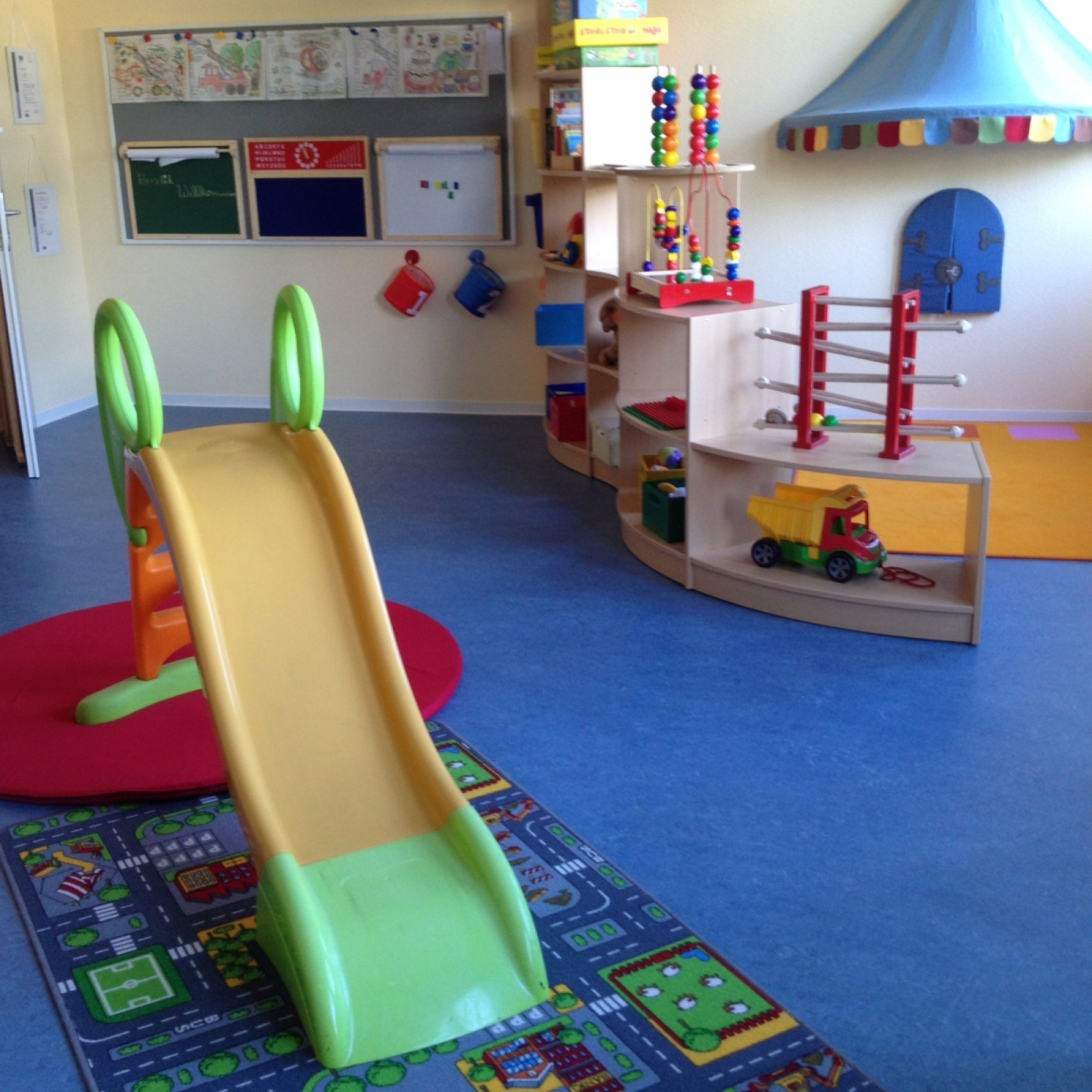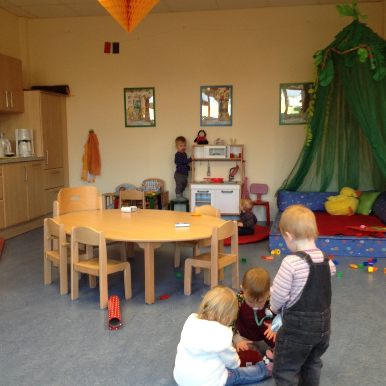Auf ca. 80 qm Fläche stehen uns ein geräumiger Gruppenraum mit integrierter Küche, ein gemütlicher Ruheraum und separate, kindgerechte Sanitäranlagen zur Verfügung.